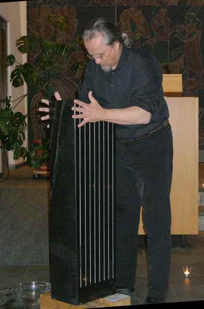 Wenn Professor Klaus Feßmann seine Hände in die Schüssel mit Wasser getaucht hat und sanft an dem dunklen, etwa ein Meter hohen Steinblock entlangstreicht, beginnt ein faszinierendes musikalisches Ereignis, das einzigartig ist: Feßmann zeigt in der Stadtkirche St. German den Gesang der Steine, tonnenschwerer Musikinstrumente. Doch so grobklotzig, wie sie da stehen, ist nur ihr Äußeres. In sich bergen sie zauberhafte Klänge - erweckt von einem, der sich seit vielen Jahren damit beschäftigt. Der Musikprofessor Klaus Feßmann, der 1951 in Nürtingen geboren ist und von 1983 Dozent an der Stuttgarter Musikhochschule war, seit 1997 als Professor am Mozarteum in Salzburg lehrt, kennt seine Steine aus teils zehnjähriger „Zusammenarbeit". Er spielt sie täglich bei Temperaturen von 18 bis 20 Grad und entlockt ihnen immer wieder neue Töne.