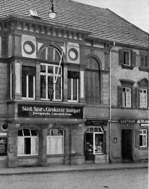 ![]() Das älteste Foto von Untertürkheim: ca. 1890 - Eckhaus Lange Straße/Eßlinger Straße - diagonal gegenüber der Alten Apotheke - Ecke Großglocknerstraße/Augsburger Str. ![]() Bäckerei Möhle - ca. 1910 im Hintergrund die ebenerdige Bahnlinie vor der Neckarbrücke |