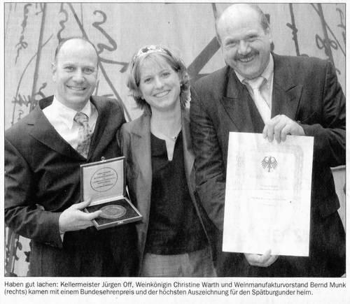Kellermeister Jürgen Off und Weinmanufaktur-Vorstand Bernd Munk kennen sich bei Siegerehrungen mittlerweile bestens aus. Reichlich geehrt kehrten sie von der festlichen Bundesweinprämierung der Deutschen Landwirtschafts-Gesell-schaft (DLG) und des Deutschen Weininstituts zurück. 558 Betriebe traten mit 3707 Weinen im Kampf um die Medaillenränge in Deutschland gegeneinander an. Die angestellten Weine hatten sich in Lanprämierungen qualifiziert. So ist es nicht verwunderlich, dass Drei-viertel der Tröpfle eine Preismünze erhielt. Allerdings nur einem Prozent, genauer 40 der 3707 verkoste-ten Weine, bescheinigten die Experten aus Weinbau, Fachpresse und Gastronomie, dass sie zu den abso-luten Spitzenweinen in Deutschland gehören. Mit ihrem 2001er Spätburgunder Trocken aus dem Barrique-fass stieß die Weinmanufaktur in jene exklusive Phalanx der feinen "Top40"-Weine vor.