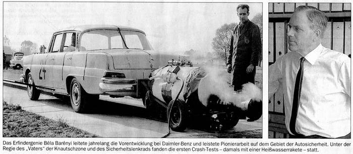 Bis dato galt das eiserne Gesetz, dass ein sicheres Auto stabil sein müsse. Visionär Barnyi erkannte jedoch, dass die Energie, die bei einem Unfall auf ein Auto wirkt, durch Verformung abgebaut werden muss, damit die Wucht die Insassen weniger verletzt. Sein Zukunftsauto hatte eine stabile Fahrgastzelle und eine verformbare Hinter- und Vorderfront. 1951 ließ er seine Idee der Knautschzone patentieren. Das revolutionäre Konzept brauchte jedoch acht Jahre, um von den Konstrukteuren übernommen zu werden. 1959 verlässt mit dem 220-er Mercedes das erste Auto mit Knautschzone die Fabrik und passive Sicherheit wurde zum Markenzeichen der Autos mit dem Stern.