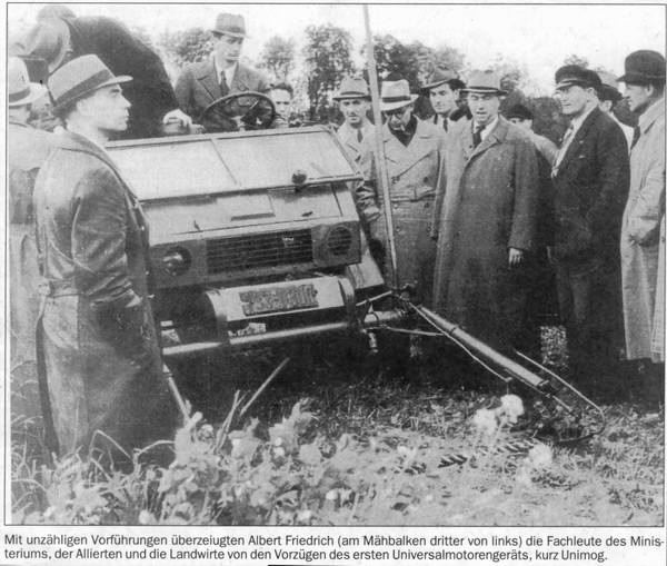 Die Geschichte des legendären Unimog beginnt so abenteuerlich wie die Zeit ist, in der dieses ungewöhnliche Automobil entsteht. Sein Erfinder ist Albert Friedrich, ehemaliger Leiter der Flugmotorenkonstruktion der damaligen Daimler-Benz AG. Er beschäftigt sich schon während des Zweiten Weltkriegs mit der Idee einer kompakten Zugmaschine. Unmittelbar nach Kriegsende beginnt Friedrich 1945 mit der Entwicklung des Unimog. Gedacht als landwirtschaftliches Fahrzeug, soll es sich jedoch ganz erheblich von klassischen Traktoren unterscheiden. Als Partner für die Entwicklung des neuen Fahrzeugs findet der Ingenieur unter anderem seinen ehemaligen Kollegen Heinrich Rößler, früher auch in der Pkw- und Motorenentwicklung von Daimler-Benz beschäftigt. Die Sache passt, denn Rößler schlägt sich seit Kriegsende als Hilfsarbeiter in der Landwirtschaft durch, kann daraus viele Erfahrungen einfließen lassen.