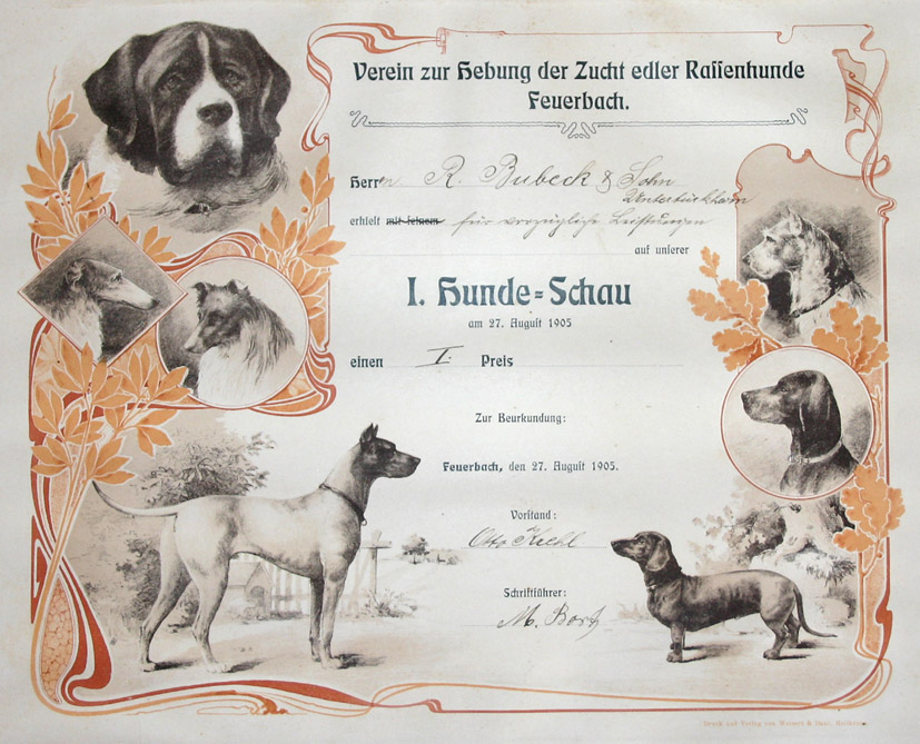 Das alte Firmengebäude Postwiesenstraße 5, für dessen Errichtung wir heute noch Baugenehmigung und Angebotsabgaben aus dieser Zeit haben. Des Weiteren befinden sich noch heute verschiedenste Dokumente aus der 117jährigen Geschichte in unserem Besitz, z.B. Urkunden der ersten Hunderassenausstellung von 1905 in Feuerbach bei der wir mit einem Ehrenpreis ausgezeichnet wurden. Des Weiteren Verkauf- und Bilanzbücher der frühen Jahre, Schreiben aus den Kriegsjahren 1938-1945 in der die Firma Bubeck als kriegswichtige Unternehmung gesehen wurde von noch heute bekannten Firmen wie Robert Bosch usw., sowie Werbematerial aus dieser Zeit. Auch war die Firma Bubeck in den frühen Jahren wohl Hoflieferant der königlichen Jagd des Hauses Württemberg.