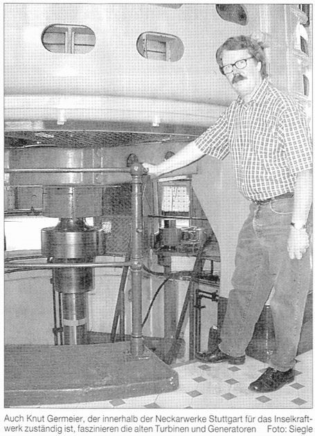 voraus. Vier Turbinen, eine Kaplan-Turbine mit verstellbaren Laufrädern und 750 Kilowatt Leistung sowie drei Francis-Turbinen mit festen Schaufelrädern und jeweils 250 Kilowatt Leistung drehen sich nahezu lautlos in der Halle. Sie erzeugen den Strom, der in das Stuttgarter Zehn-Kilovolt-Netz eingespeist wird. Dieses Netz verbindet die jeweiligen Ortsteile miteinander, die Spannung wird in Umspannwerken auf die im Haushalt üblichen 380 Volt heruntertransformiert."Großkunden wie etwa DaimlerChrysler würden die zehn Kilovolt direkt erhalten, da sie werkseigene Trafos besitzen. Um jedoch die erforderliche Spannung des Netzes zu erhalten, muss zuerst einmal hochtransformiert werden, da der Generator nur drei Kilovolt liefert", erklärt Germeier.