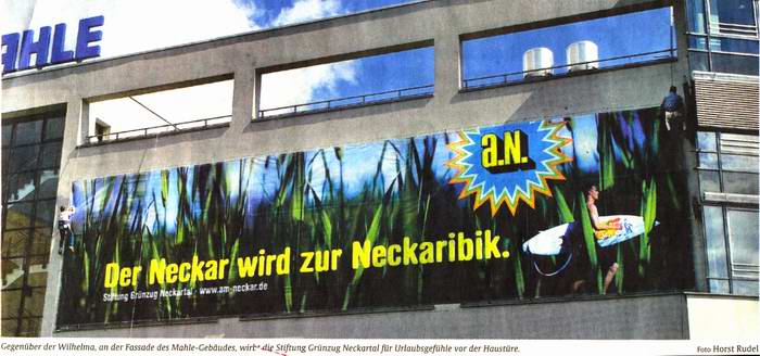 Für eine größere Breitenwirkung soll eine Kampagne sorgen, die die Stuttgarter Niederlassung des Werbekonzerns Jung von Matt kostenlos kreiert hat. "Wir wollen Lust auf eine tägliche Portion Urlaubsgefühl direkt vor der Haustüre wecken: auf wandern, grillen, plantschen, träumen", sagte der Geschäftsführer Achim Jäger. 24 verschiedene Plakate, knallgelbe T-Shirts mit der Aufschrift "Neckaribik", das Logo "a. N." (für: "am Neckar") und ein Internetauftritt sollen die Stiftung als Markenzeichen in der Region bekannt machen. "Unsere Arbeit ist ein Bekenntnis zum Fluss", sagte Jäger.
