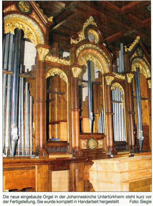 Aus Neckarblick vom 25.9.2003: Untertürkheim. Zur Orgelweihe am Samstag, 4, Oktober, werden die Gemeindemitglieder der katholischen St. Johannes-Kirche mit altehrwürdigen Klängen empfangen. Bis dahin soll die neu errichtete Orgel spielbereit sein. Der Blick zur Empore der Johanneskirche zeigt eine reich verzierte Orgel. So harmonisch fügt sie sich in das Bild ein, dass man meinen könnte, sie hätte schon immer dorthin gehört. "Für die renovierte Kirche ist die Orgel das i-Tüpfelchen", sagt Wolfgang Braun. "Sie stammt aus dem Jahre 1889 und ist damit in Stuttgart das älteste Instrument seiner Art."