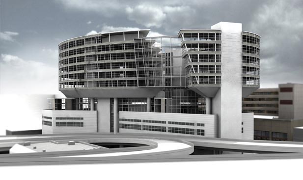 Prüffeldern sechs ellipsenförmigen Büroetagen schweben.