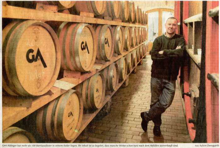 ![]() Gert Aldinger hat mehr als 100 Barriquefässer in seinem Keller liegen. Ihr Inhalt ist so begehrt, dass manche Weine schon kurz nach dem Abfüllen ausverkauft sind. Foto Achim Zweygarth |